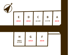 | 面積 | B号地165.20㎡(49.97坪)・C号地161.07㎡(48.72坪)・H号地186.56㎡(56.43坪) |