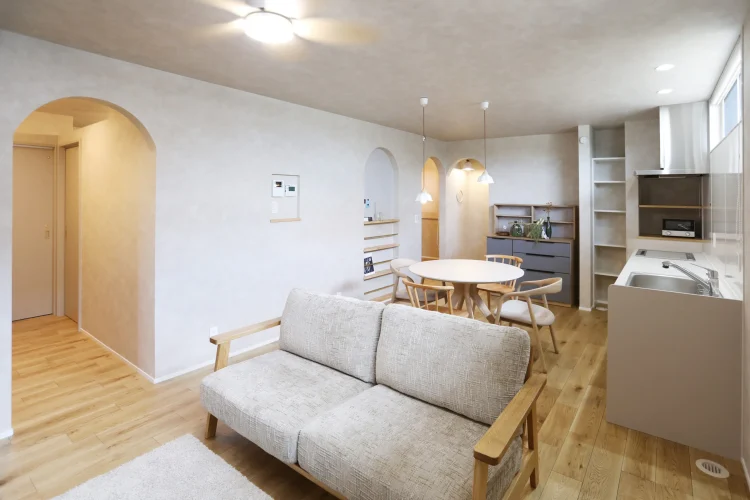 塗り壁の外観にアーチ壁、家型のニッチなど、まるで絵本の世界のような可愛らしさを詰め込みました。壁付けキッチンや回遊できるファミリークローゼットを採用し、23坪というコンパクトな空間を賢く活用。