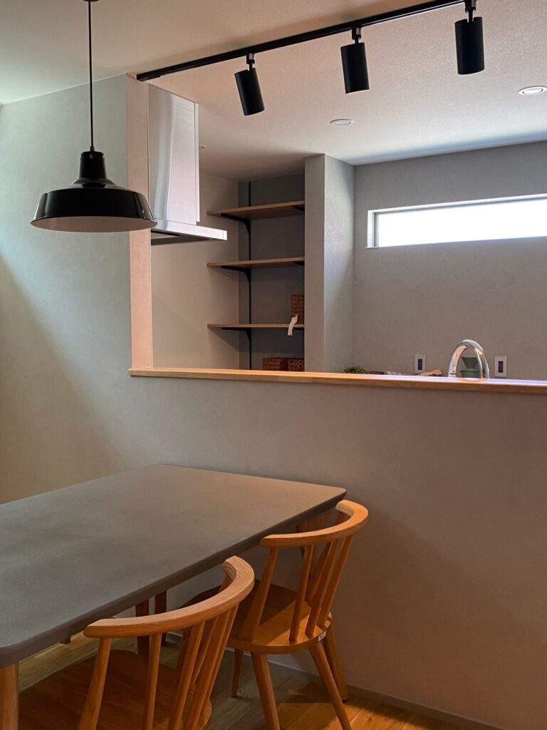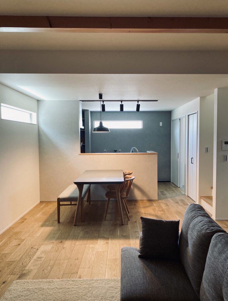開放感あふれるこのLDKは、梁見せ天井が空間に奥行きを与え、視線が自然と上へと抜けていく設計です。