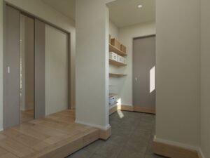 このお家は、玄関からご家族のスペースを通らず、そのままお風呂場へ直行できる「ただいま動線」を採用しました。