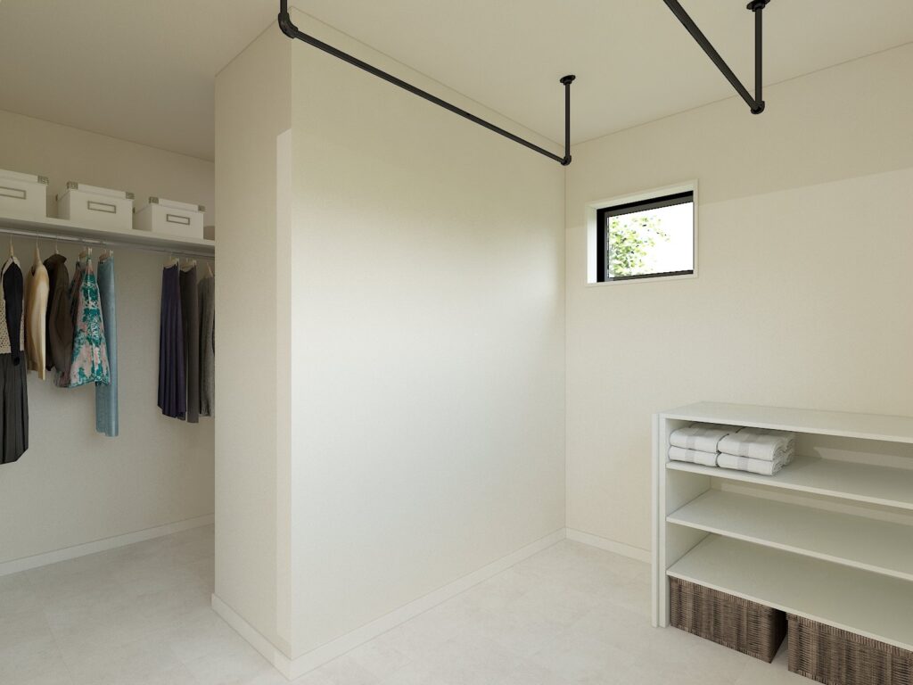 日々の家事負担をぐっと減らすため、広々としたランドリースペースから大容量のウォークインクローゼットへと直接つながる「家事ラク動線」を採用しました。