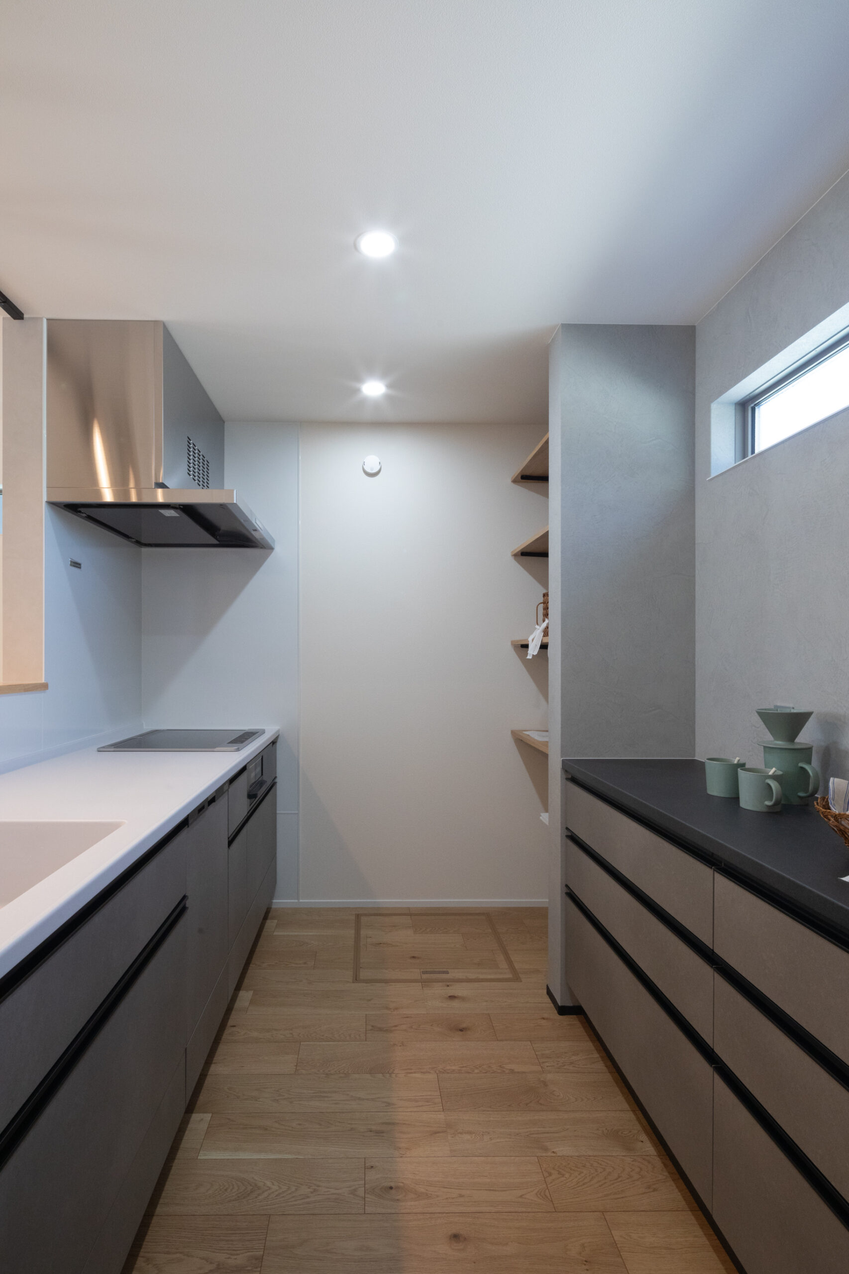 照明の光がキッチンのグレーの質感をより美しく引き立て、洗練された印象の中で心地よく料理を楽しめる空間に仕上がっています。