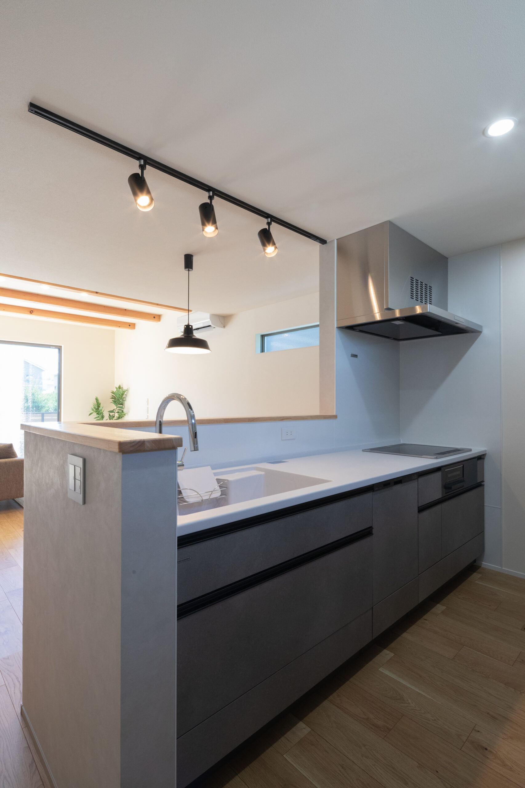 黒のスポットライトがキッチン空間に上質な雰囲気をプラス。