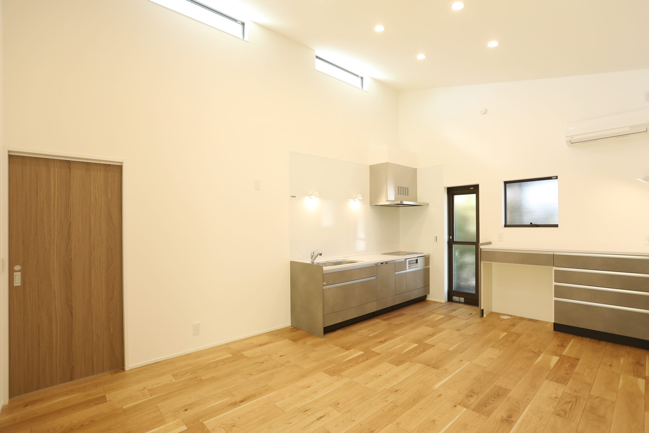 高窓から差し込むやわらかな自然光が空間全体に均一に広がり、落ち着きのあるリビングに仕上がっています。